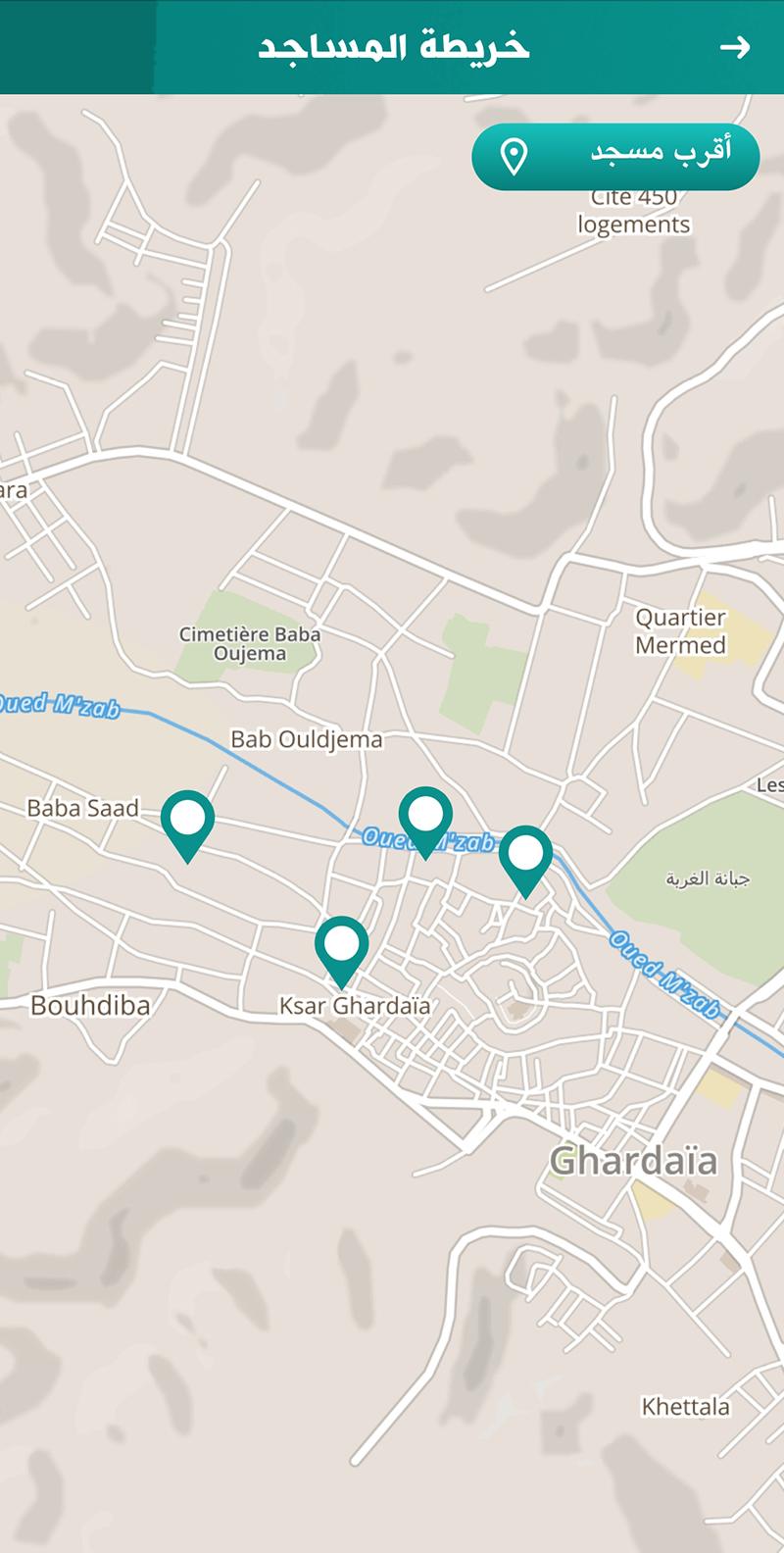 خريطة لمجموعة المساجد الموجودة في المنطقة القريبة للمستخدم.