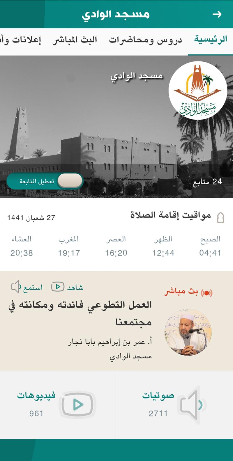 هام جدا: التطبيق ليس بديلا عن العمارة الحضورية للمسجد، إنما هو وسيلة دعائية للحضور والمتابعة، وربط لذوي الأعذار بالمسجد.